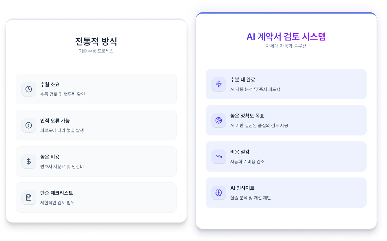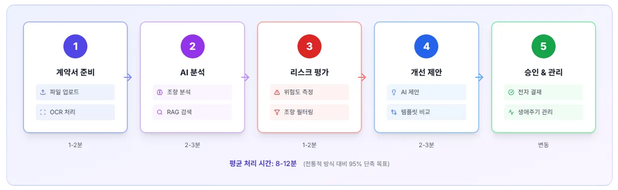 계약서의 법적 리스크를 자동으로 분석하고, 누락된 조항을 식별하며, 승인 프로세스를 디지털화합니다.